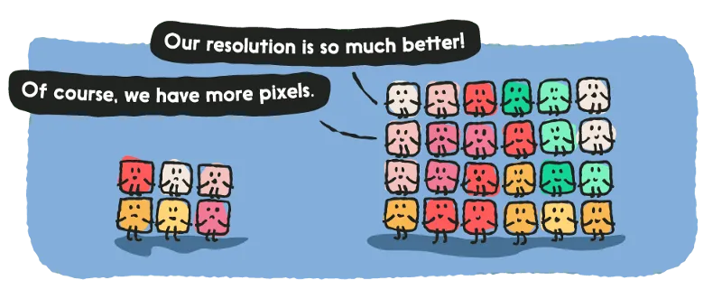 不过,我们仍然可以粗略地理解为 —— 一张同样大小的图片,它所包含的像素点越多,它就越清晰,细节内容就越多。