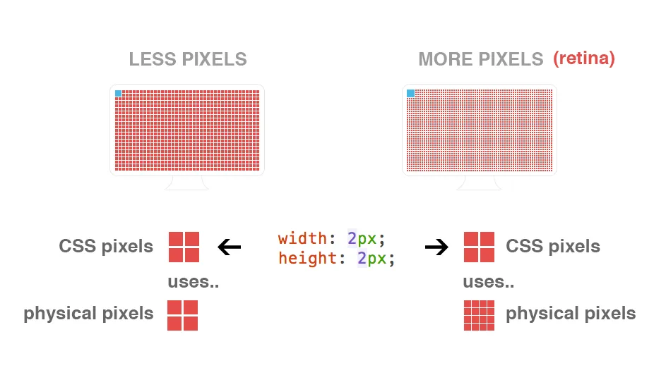 注意我们所说的是一维的概念,如果我们要扩展到二维的概念,就需要相乘一下,比如在 window.devicePixelRatio = 2 的情况下,1 CSS 像素等同于 2 物理像素,那么我们若要画出一个 2x2 的正方形,就需要用到 (2x2) x (2x2) 个物理像素,也就是 16,这只是很简单的乘法运算而已。