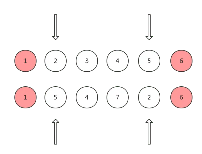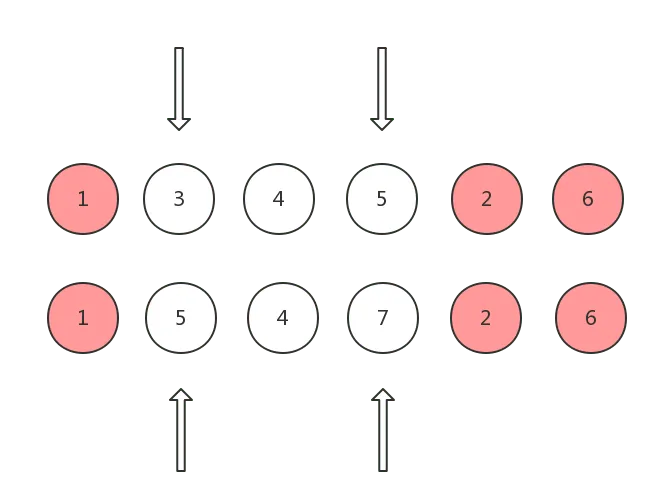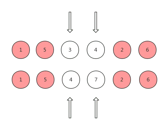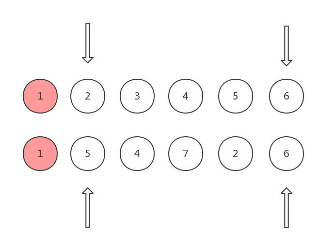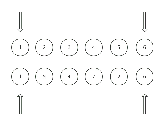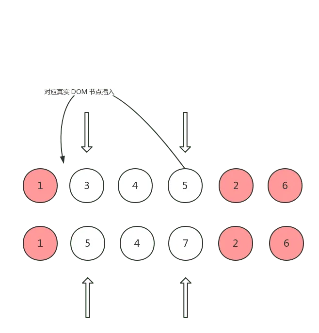 以下图为例,两个数字相同则代表两个 vnode 相同,第一排为 old children, 第二排为 new children: