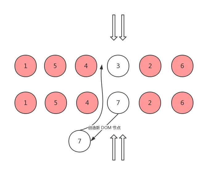 这种情况说明,oldCh 已经不存在可复用的节点了,因此需要根据 ch 头指针所指向的 vnode 创建新的 DOM 节点,并插入到 oldCh 头指针所对应的真实 DOM 之前: